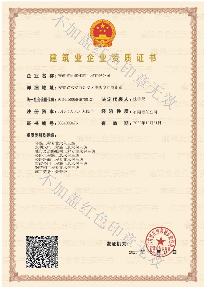 安徽省恒鑫建筑工程有限公司成立于2010年11月,是一家以房屋建筑、市政工程,水利水電、公路橋梁、建筑智能化等施工為一體的民營企業,經過多年的發展,企業注冊資本5616萬元人民幣,現有員工150余人,獲得本科以上學歷的人員近20%,大專以上的人員超過50%;二級以上注冊建造師18人,中級以上職稱人員100余人。